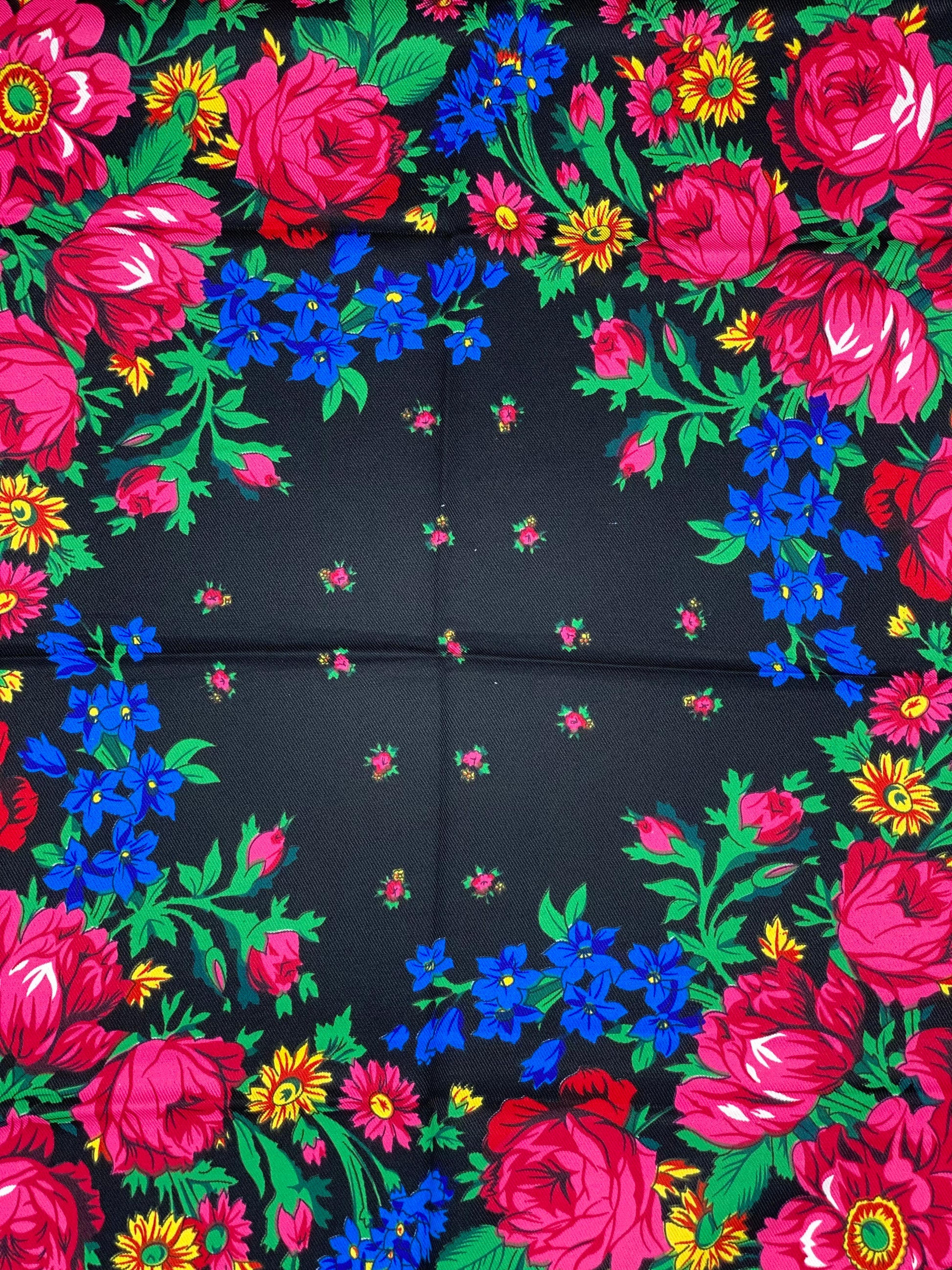 Also known as a Kokum scarf or granny hankie, this scarf features a classic black background adorned with vibrant blooms in pink, blue, and green.